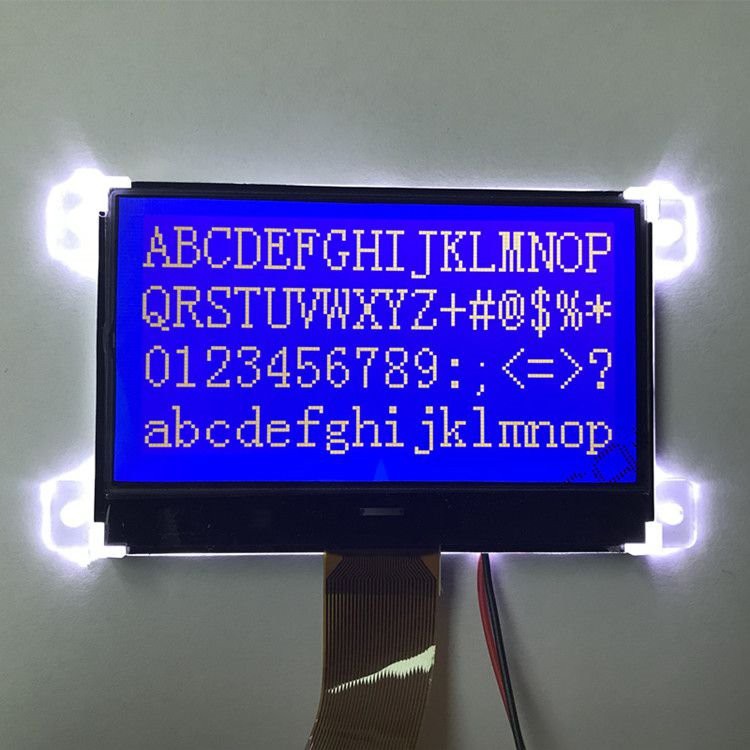 ماژول صفحه نمایش LCD برای دستگاه مخابره داخلی از راه دور یک ال سی دی گرافیکی آبی 2.8 اینچی با 128x64 پیکسل، کاراکتر سفید در پس زمینه آبی، STN، Transmissive LCD، کنترلر ST7565R، 4 عدد نور پس زمینه LED سفید، کانکتور FPC، تراشه روی شیشه است.